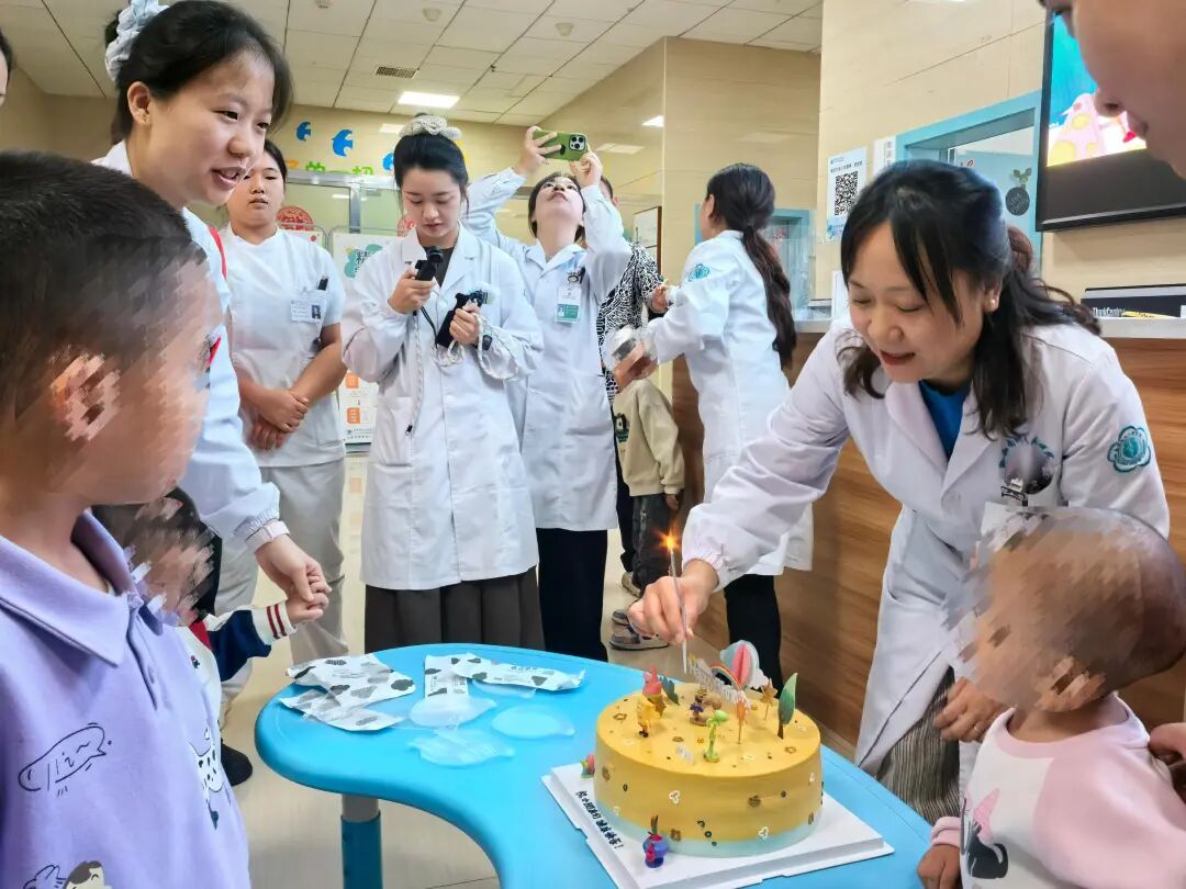 当生日歌旋律响起,医护人员推着点满蜡烛的蛋糕缓步入场。烛光映照下,孩子们的小脸格外明亮。“3、2、1——呼!”在康复师引导下,孩子们鼓起腮帮合力吹灭蜡烛。分发蛋糕时,7岁的星星(化名)突然举起塑料刀:“老师先吃!”这句清晰的表达让现场瞬间安静,随即爆发热烈掌声。儿童保健科主任肖春霞接过蛋糕时眼眶发热:“这些孩子教会我们,生命的成长从不只有一种模样。”