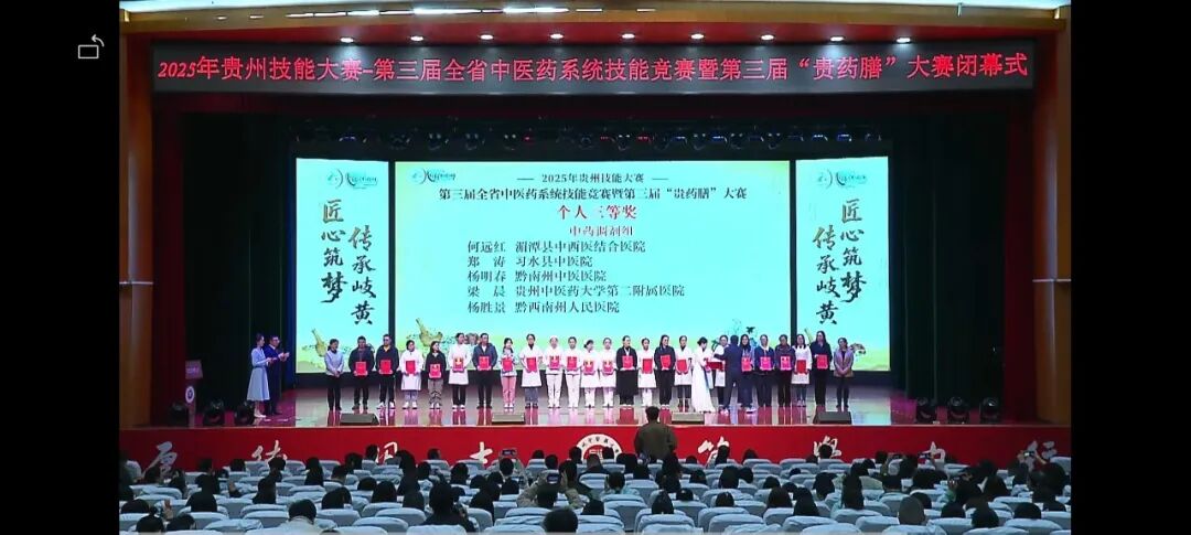 除药膳组比赛外,本届贵州省中医药系统技能竞赛还设有中医组、护理组、中药调剂组、医院感染管理组等多个赛项。我院中药房杨胜景在比赛中表现突出,荣获“个人三等奖”,展现了我院中医药人才的专业素养与技能水平。